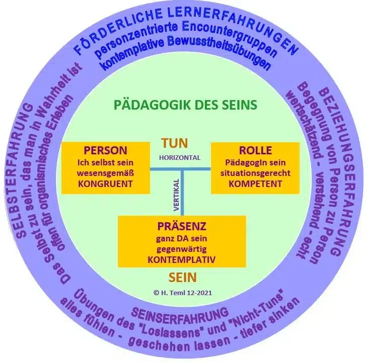 Wegen seiner ganzheitlichen Lernangebote spreche ich auch von einer „Pädagogik des Seins“ , in der vor allem die vertikale “Tiefendimension” menschlicher Existenz mit dem Begriff der “Präsenz” von Pädagog:innen angesprochen wird.